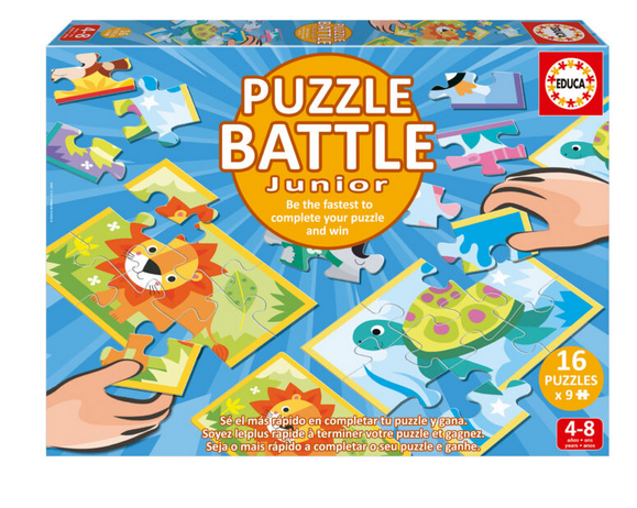Educa vous propose des animaux de Puzzle Battle Jr, une vraie bataille de puzzle. Il contient 16 puzzles de 9 pièces (144 pièces), 16 cartes d’image, des instructions.