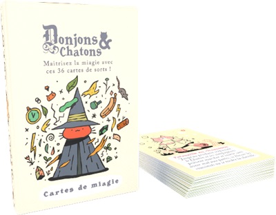 Ces 36 cartes reprennent tous les sorts du livre de base de Donjons et Chatons avec d’un coté de nouvelles illustrations et de l’autre les informations utiles en jeu.