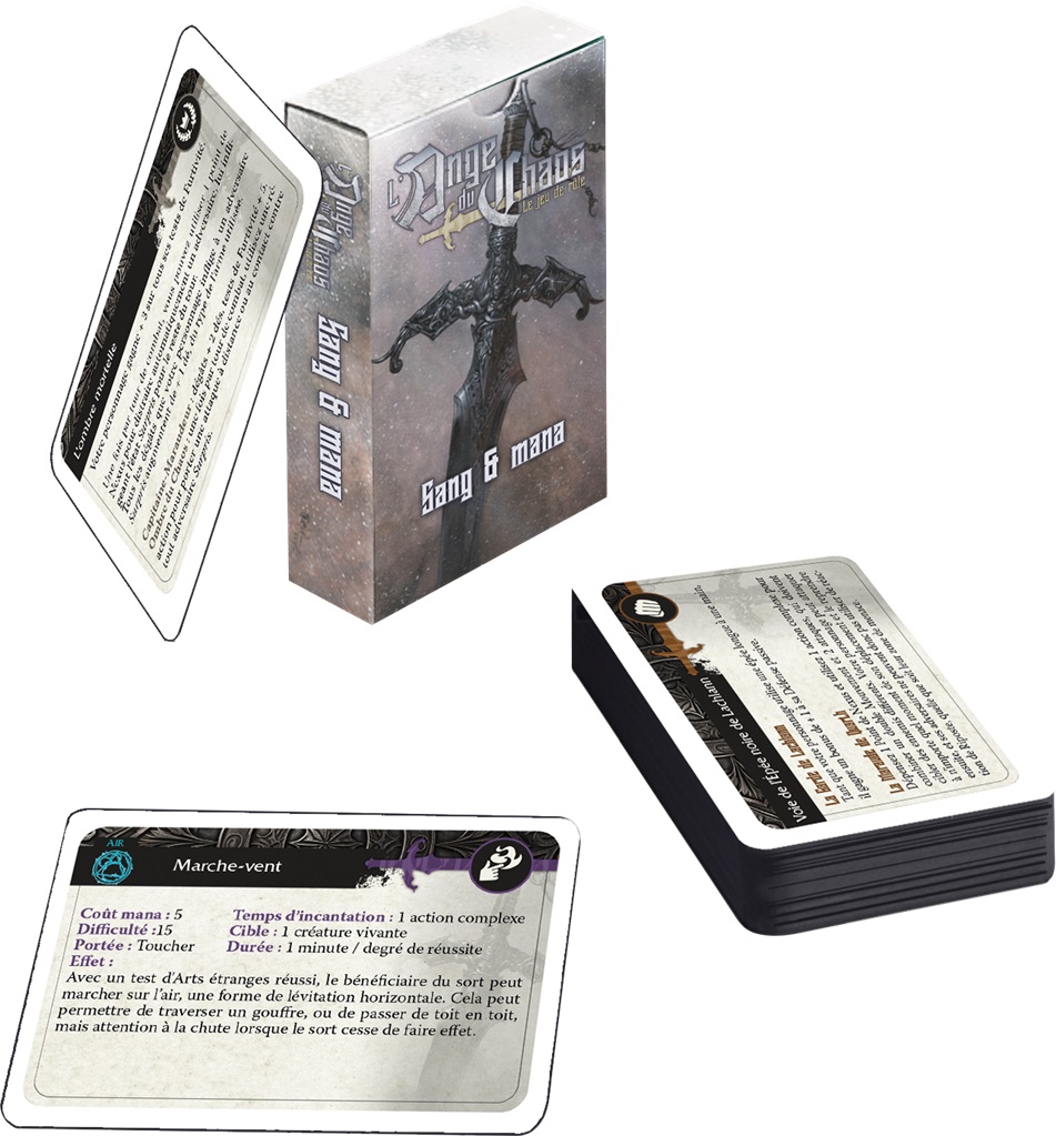 Sang et Mana 1 est un paquet de cartes pour le jeu de rôle l’Ange du Chaos. Aide de jeu idéale pour les joueurs comme les maîtres de jeu, il contient les 22 cartes des Arts martiaux et leurs Coups spéciaux, les actions de combat particulières, les sorts des sources du Sang, Inanimé et d’Ombre.